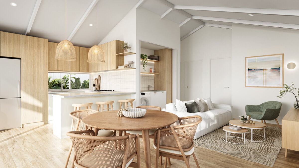 Project Highlights – Interior- Open-plan kitchen, dining, and living area with raked ceilings to enhance light and space